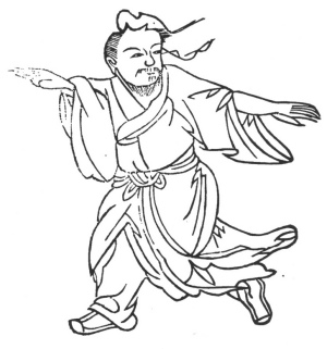 Place the two hands in front and behind (one in front, the other behind), like grasping a horse and putting aside flowers, the feet also to be placed in front and behind, and take steps in performing the exercise. For white dysentery, let the air advance directed to the left in 9 mouthfuls; for red dysentery, the same to the right.