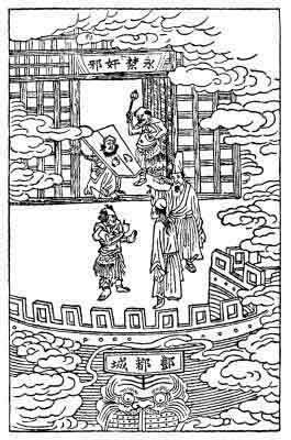 quite independently of Christian influence, is nevertheless, practically the same. This may be seen by a comparison of the lower part of the illustrations of this story and the next with the typical conception of hell as held in Christendom during the Middle Ages. Our picture is a reproduction of a German woodcut made at the time of the Reformation, but similar representations can be met with in the literature of the same age in other Christian countries. One of these appears on the main entrance of the Cathedral of Bourges, France (Carus, History of the Devil, p. 181). The Chinese conception was directly derived from India, indirectly from Babylon, and the Christian view can be traced to the same source.]