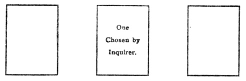 The cards must now be taken up again, shuffled, and cut as before. The dealer then makes them into three packs, having been careful to place the first card apart for "the surprise." Two of the packs will consist of seven cards, the third of only six. The inquirer is then asked to choose one of the packs, which must be exposed face upwards, moving from left to right, and these six or seven cards, as the case may be, should be read according to their significations. This operation is repeated three times, so that at the finish "the surprise" consists of three cards, which Are exposed and read last of all.