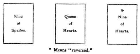 The surprise is now turned up and contains the king of spades, a dark, ambitious unscrupulous man who has interfered with the love affairs of the fair woman, the queen of hearts, to whom the inquirer has made an offer, so far without success; the third card is the nine of hearts, reversed, which tells that it will be but a passing cloud that will separate the lovers.