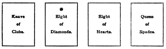 Here is an example of the way in which the packs may turn out. We will suppose that the inquirer is represented by the queen of clubs. Her choice falls on the middle pack, which contains the following cards: the knave of clubs, the eight of diamonds, reversed,, the eight of hearts, and the queen of spades.