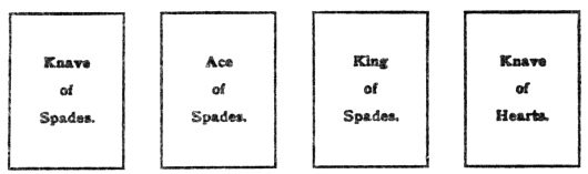 The next pack, standing for "The House," is made up of the knave of spades, the ace of spades, the king of spades, and the knave of hearts. We will take their signification as they stand. The three spades mean disappointment. The presence of two knaves together speaks of evil intentions.