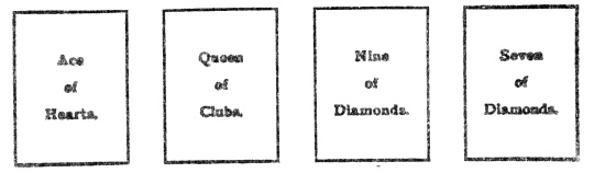 "The Surprise" is very closely connected with the inquirer herself, for we find her included in the four cards. There are the ace of hearts, the queen of clubs, the nine of diamonds, and the seven of diamonds. From this we gather that there is a love letter for the inquirer, which, however, may be delayed by some cross accident, and she will thus be exposed