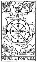 "It symbolises Fortune, good or bad." (M.) So this means happenings, facts. It is indeed in the Tenth house, that the relation between the Self and the Not-self crystallises into fact, happening, deed. Says P., identifying this card with the significance of the Hebrew letter Yod, that it indicates "the finger of man; the forefinger extended as a sign of command." This clearly has to do with the significance of the Tenth house as that of authority and authorities, who are qualified to give commandments. The commandment itself comes under the same resort. "This letter has therefore become the image of potential (?) manifestation, of spiritual duration and, lastly, of the eternity of time." In
