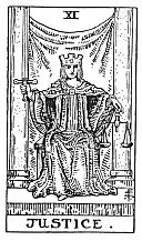 The astrologer says, that the Eleventh house is the house of the 'friends.' This means, that it contains those who are with us, and that which we have within the limit of our power, because 'friendly,' is that which is understood. The forces of nature, which we have mastered, are friendly to us and this is very well expressed by the woman who "is closing the jaws of a lion." The latter stands for passion more particularly. She derives this force from the eternal or superhuman and this is indicated by the lemnescate above her head. In older editions of the card 4 we find half the symbol for Aquarius, as a line of vibration added to it: