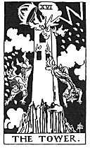 So the card of the Tower signifies the relation between macro- and micro-cosm and will mean rupture, sudden disillusion, disenchantment, but also it symbolises intuition, renewal, help from above and clear insight in relation to vanity and sham projects, illusion and meaningless formalism.