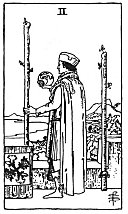 THEORY: Air on the Second house, that of Taurus, which explains at once the latter significances ascribed to the card by some authors; the other category of definitions derives from the earthy nature of the Second house, which, put into the tone of the airy element, may cause something of the oppression, which the heaviness of this fixed and earthy house exercises on the mind. It is the impression of heaviness, of a load on the back, which easily may attain the more concise form of a fear, a gloom, a feeling of being downcast, impotent, weak and not able to resist circumstances. So it may signify the
