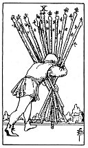 tenth house rules the actions, deeds and attitude. Also the name and official position of the personality in the world and at the same time the superiors or authorities, met with on account of position and activities. Actions and deeds, under the influence of the double-natured mercurial element, may easily degrade into 'double-dealing' and everything else of that nature. But once more it appears to us, that the gypsy tradition is rather too much exclusively on the lower side of things. The qualities mixed here make very often an egoistic blend and a nature which reveals several weaknesses, as soon as it comes under trial. So the card on the one hand means certainly that the attitude of mind or action will be untrustworthy and must not be relied upon. There is fear and cowardice in it. But on the other hand the combination is that of mental ability, quick perception, etc. It means also the load of the earthy responsibility laid upon the shoulders of an airy creature, consequently 'oppression' is a word very much to the point here. And this explains even why weaker natures are driven to undesirable, unreliable actions and reactions by it; they cannot stand the pressure. Strong natures, however, accept the pressure as natural necessity, karma, and carry their burden. This is symbolised by the man carrying the ten wands. It is a symbol of executive ability, production, the doing of necessary things, obedience to official order and rule; officials, 'red tape' and burdens that appear heavier than they actually are.
