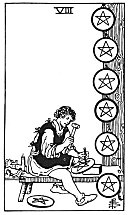 THEORY: It is the Fire on the Twelfth house. This has not much to do with useful work directly, nor with employment, but very much with skill and ingenuity, genial finding-out of the nature of things, so 'craftsmanship' may stand. For the rest, it is the house of offering, devotion, self-undoing, imprisonment and treason. The combination of the fire of the heart with it produces very different effects. Above all it gives skill and bravery, far above the average, outdoing the commonplace, neglecting fashion, sinning against tradition but widening the views and outlook. Dexterity will ensue from it. In matters of the heart it always tends to the unusual, superhuman, exotic, wayward, strange or dreamy. The illustration of the card is to be taken more as a warning against the dangers of this house than as a direct descriptive image of its nature; as a sort of hint: keep to your work, do not let yourself be led astray or misguided. It is also the house of the sick, the hospital and the addiction of 'hospitality' may well allude to this fact. Charity comes under it. That ambitions are wrecked in this house is correct in general, still the pentacles are never strong in any evil sense, and they are apt to wreck fortunes or bubble reputations rather than ambitions. With 'avarice' it has nothing to do whatever, as far as we can see. The 'dark girl' is another question: apart from the court-cards the ace is very often taken to indicate a boy or youth, the eight a girl. The cups are generally taken to denote fair people, the pentacles dark people. Apart from this Eteilla makes the