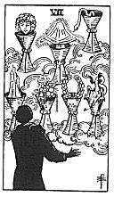 THEORY: If we eliminate 'soul . . . spirit . . . and desire,' words too far apart from the original meaning, we find in tradition a very pure rendering of the effects of the Water of the soul on the house of Gemini, the Third, the house of the changeful concrete mind and thought in which indeed nothing is permanent, and everything is passing, ephemeral. These effects must be very varied, including the most fantastic plans and conceptions, and 'fancy' is the most fitting word for this card. It will denote many intellectual proceedings and has to do with travelling for short distances, sight-seeing, considering, gathering impressions, etc. The word 'reflexion' is really quite appropriate in its place here, because the card represents the conditions of mind in which the surroundings are simply reflected in the soul. There may come seductive and suggestive images, some of which may be realised, but others will remain just fancy. The description which is given by W. is very accurate and points to the fact, that under the third house come nature-spirits and genii, who will eventually help, guide or mislead man.