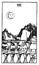 THEORY: On the Fourth house the Water of the soul will be in its own element, so to speak, and will consequently rejoice in its existence, swimming in agreeable sensations, the family and the memory, as far as the personal life goes, playing important rôles in the life of the querent. The lunar and Jovian element passing over this house will almost certainly cause the home and family-life to be forsaken or relinquished; this perhaps may account for the interpretation: "Deserting the cups of his felicity." We should prefer to substitute for "felicity" his family or intimate circle. Changes in home-life, be it for the better or for the worse. There cannot be much of order or rule in this combination, and disorder or chaos is threatened. The strong Cancerian peculiarities, such as shyness, timidity, prudishness, etc., may appear here, but we can see no reason for addictions like 'great joy, feasting,' etc. Feelings, sentiments, wishes have very little chance of becoming reality in this house, and this may be called the true reason for 'leaving the house.' The latter seems to us to be the proper meaning: either leaving the safe and comfortable home, or losing the chance to realise more ambitious projects. Being the eighth card of the suit, it may denote a girl, and cups are said to be related to the fair or 'blonde' type.