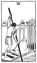 THEORY: This is the element of Earth on the Sixth house, and the Virgo-particulars expressed in 'earth' become the 'ways' that carry the message from the centre, the heart, to the parts of the system. So it is the nervous system and the arterial system in the animal and human body. Thus it must be the way or path leading out into the world from our house or living place. This explains what tradition says about envoy and emigration, though the latter is somewhat far-fetched, and not in every instance will the way lead so far as that, nor the path be trodden until we meet with a 'proposal of love.' But it is true, that the effect of that which this card represents may go far and in general signifies the message in the sphere of matter (Mercury is lord of this house), the message materialised. And this explains why tradition says it means 'apparition'--'publication'--'constitution' etc. It is quite correct therein. The message is conveyed by means of the way, path, canalisation, etc., and appears in some effect or other. So it may even be a vision or materialisation from the 'other side.' It may also, however, be the passing over to that side, the crossing of the Styx, which seems to be indicated by the picture of this card. The cusp of the seventh house in the horoscope