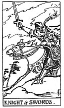 THEORY: Finally this element on the Fourth and on the Twelfth houses. On account of the former we find of course the armed man under the rule of the Emperor, the military man, soldier, etc., but rather the professional, formerly the hired, troops than the militia, which will rather fall under the same house as the police, and be indicated by the page of swords. Another significance of this card is that of painful memories, suffering by ancient wrongs. In fact war is in all cases, be it private or collective, the phenomenon of the outbreak of some ancient wrong or evil--the wrong of oppression on one side or the evil of desire, rapacity, overflowing force, etc., on the other. So the Knight of swords must bear the significance of the bearer of weapons, which avenge wrongs or serve attacks. The fourth house calls the home and the family, the father in particular, and the