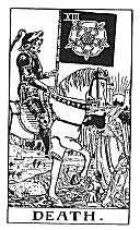 There should be no need to point out that the suggestion of death which I have made in connection with the previous card is, of course, to be understood mystically, but this is not the case in the present instance. The natural transit of man to the next stage of his being either is or may be one form of his progress, but the exotic and almost unknown entrance, while still in this life, into the state of mystical death is a change in the form of consciousness and the passage into a state to which ordinary death is neither the path nor gate. The existing occult explanations of the 13th card are, on the whole, better than usual, rebirth, creation, destination, renewal, and the rest.