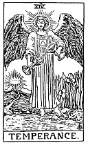 So also are the conventional meanings, which refer to changes in the seasons, perpetual movement of life and even the combination of ideas. It is, moreover, untrue to say that the figure symbolizes the genius of the sun, though it is the analogy of solar light, realized in the third part of our human triplicity. It is called Temperance fantastically, because, when the rule of it obtains in our consciousness, it tempers, combines and harmonises the psychic and material natures. Under that rule we know in our rational part something of whence we came and whither we are going.