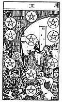 A man and woman beneath an archway which gives entrance to a house and domain. They are accompanied by a child, who looks curiously at two dogs accosting an ancient personage seated in the foreground. The child's hand is on one of them. Divinatory Meanings: Gain, riches; family matters, archives, extraction, the abode of a family. Reversed: Chance, fatality, loss, robbery, games of hazard; sometimes gift, dowry, pension.