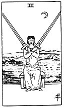 A hoodwinked female figure balances two swords upon her shoulders. Divinatory Meanings: Conformity and the equipoise which it suggests, courage, friendship, concord in a state of arms; another reading gives tenderness, affection, intimacy. The suggestion of harmony and other favourable readings must be considered in a qualified manner, as Swords generally are not symbolical of beneficent forces in human affairs. Reversed: Imposture, falsehood, duplicity, disloyalty.