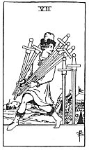 A man in the act of carrying away five swords rapidly; the two others of the card remain stuck in the ground. A camp is close at hand. Divinatory Meanings: Design, attempt, wish, hope, confidence; also quarrelling, a plan that may fail, annoyance. The design is uncertain in its import, because the significations are widely at variance with each other. Reversed: Good advice, counsel, instruction, slander, babbling.