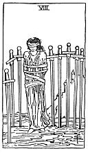 A woman, bound and hoodwinked, with the swords of the card about her. Yet it is rather a card of temporary durance than of irretrievable bondage. Divinatory Meanings: Bad news, violent chagrin, crisis, censure, power in trammels, conflict, calumny; also sickness. Reversed: Disquiet, difficulty, opposition, accident, treachery; what is unforeseen; fatality.