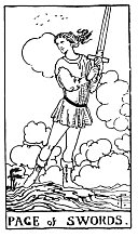 A lithe, active figure holds a sword upright in both hands, while in the act of swift walking. He is passing over rugged land, and about his way the clouds are collocated wildly. He is alert and lithe, looking this way and that, as if an expected enemy might appear at any moment. Divinatory Meanings: Authority, overseeing, secret service, vigilance, spying, examination, and the qualities thereto belonging. Reversed: More evil side of these qualities; what is unforeseen, unprepared state; sickness is also intimated.