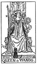 The Wands throughout this suit are always in leaf, as it is a suit of life and animation. Emotionally and otherwise, the Queen's personality corresponds to that of the King, but is more magnetic. Divinatory Meanings: A dark woman, countrywoman, friendly, chaste, loving, honourable. If the card beside her signifies a man, she is well disposed towards him; if a woman, she is interested in the Querent. Also, love of money, or a certain success in business. Reversed: Good, economical, obliging, serviceable. Signifies also--but in certain positions and in the neighbourhood of other cards tending in such directions--opposition, jealousy, even deceit and infidelity.