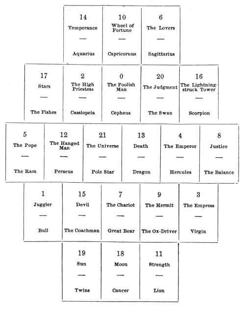 In any case the arcana of the Tarot explain many of the anomalies in Greek mythology. We cannot now enter into any minute details upon this subject, for it would lead us beyond the limits of this book. We must content ourselves with giving the reader a tableau indicating the constellations which appear to correspond with the 22 major arcana of the Tarot, and therefore with the 22 letters of the Hebrew alphabet, although their correspondence