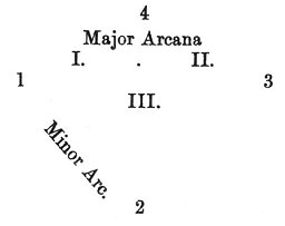The 12 minor arcana indicate the different phases through which the individual life will pass, or the evolution of the event during the four great periods: Commencement, indicated by the major arcanum I., which displays its character; Apogee (arc. II.); Decline or Obstacle (arc. III.); Fall (arc. IV.).