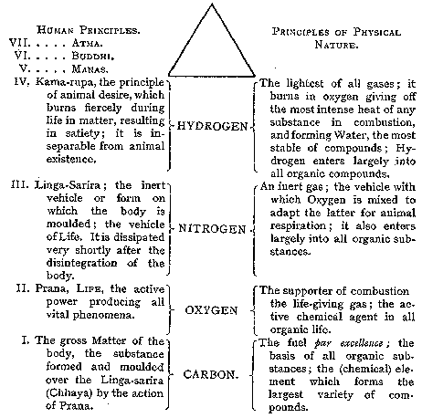 [[Continued from previous page]] three aspects, or adjunct principles out of calculation, they accept only four Upadhis (bases) including the Ego -- the reflected image of the Logos in the "Karana Sarira" -- and even "strictly speaking . . . . only three Upadhis." For purely theoretical metaphysical philosophy, or purposes of meditation, these three may be sufficient, as shown by the Taraka Yoga system; but for practical occult teaching our septenary division is the best and easiest. It is, however, a matter of school and choice.