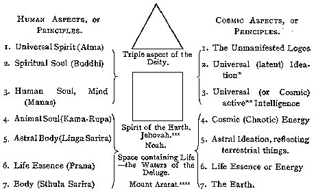 Spirit, Soul, and body. Behold, the Taraka Raja Yoga of India limits that division to 3, we, to 4, and the Vedantins to 5 (koshas)." To this, we of the Archaic school, ask: --