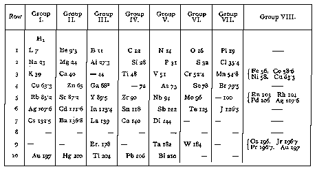 Thus, if the chemical elements are arranged in groups according to their atomic weights, they will be found to constitute a series of groups of seven; the first, second, etc., members of each group bearing a close analogy in all their properties to the corresponding members of the next group. The following table, copied from Hellenbach's Magie der Zahlen, exhibits this law and fully warrants the conclusion he draws in the following words: "We thus see that chemical variety, so far as we can grasp its inner nature, depends upon numerical relations, and we have further found in this variety a ruling law for which we can assign no cause; we find a law of periodicity governed by the number seven."