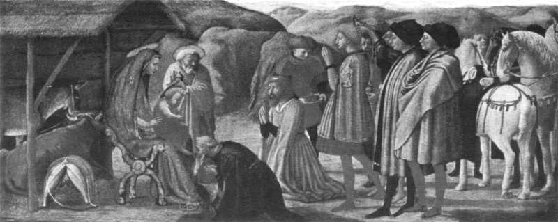 How suggestive this is of the Magi pictures of the fifteenth century, with their gorgeous eastern monarchs and retinues of countless servants and strange animals. No other story in the New Testament gives such opportunity for pageantry as the Magi scene. All the wonder, richness, and romance of the East, all the splendour of western Renaissance princes could lawfully be introduced into the train of the Three Kings. With Gentile da Fabriano and Benozzo Gozzoli it has become a magnificent procession; there are trumpeters, pages, jesters, dwarfs, exotic beasts—all the motley, gorgeous retinue of the monarchs of the time, while the kings themselves are romantic figures in richest attire, velvet, brocade, wrought gold, and jewels. It may be that much of this splendour was suggested to the painters by dramatic spectacles which actually passed before their eyes.