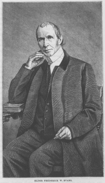 Frederick W. Evans is an Englishman by birth, and was a "reformer" in the old times, when men in this country strove for "land reform," the rights of labor, and against the United States Bank and other monopolies of forty or fifty years ago. He is now sixty-six years of age, but looks not more than fifty; was brought to this country at the age of twelve; became a socialist in early life, and, after trying life in several communities which perished early, at last visited the Shakers at Mount Lebanon, and after some months of trial and examination, joined the community, and has remained in it ever since—about forty-five years.