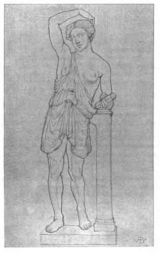 show it uplifted above the head), the left hand drawing the drapery away from her wounded side. There is no sign of the a-mazon mutilation in this statue; the right breast is exposed, but the left is expressed, though covered by drapery. The Berlin wounded Amazon has her right arm lifted above her head, as though instinctively raised from the sword-thrust in her side. She leans with her left arm on a column, her left leg is drawn back, contracted by pain; but, clear as is the evidence of anguish, there is no contortion of limb or features. The chiton is quite short, and there is little drapery over the upper part of the body; but the folds, which are elaborate, are at once decorative and natural. This statue has been attributed to Polyclitus, but is probably more justly claimed to be a copy of the original bronze, which may, according to the delightful story, have been the one set up in the Temple of Diana at Ephesus. It will be remembered that, according to a never-too-probable occurrence reported by Pliny, Pheidias, Polyclitus, Cresilas, and Phradmon, all competed for the honour of providing the ex veto Amazon, each being asked to make his vote for the best work. Each placed his own statue first and that of Polyclitus second, virtually a majority verdict for the latter. Though this story of competition has a certain air of reasonableness about it (for, according to very ancient tradition, Ephesus, whether or not originally founded by the Scythian women warriors, had given them refuge when hard pressed during their retreat after their dash into Attica), all that we can deduct from it is that statues of Amazons were shown in the