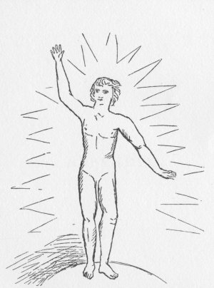 She described the attitude and expression of Adonai as those of the absolute calmness and repose of the power without effort which is predicable only of the Infinite. Though bearing the aspect of humanity, it was impossible, she felt, to represent the form in fixed outline, and declared that it seemed like a sacrilege to attempt thus to portray it. She nevertheless made the attempt, with the result reproduced opposite. It represents, however, only the masculine aspect, the impression of the feminine having entirely failed to reach her outer consciousness; and this had been the case also on the only other occasion on which she had beheld it. (See p. 54.) In this respect our experiences differed. She was most strongly impressed by the masculine, or will, element in Deity; and I by the feminine, or love, element. In another respect, too, there was a difference. For her the form was that of one standing erect and, though calm, energetic: for me it was that of the "Sitter on the Throne" and wholly reposeful, though similarly engaged in the act of projection and recall. These differences were doubtless due to difference of temperament in the beholders. The soul is a living lens which invests with its own "tincture" the objects beheld by it.]